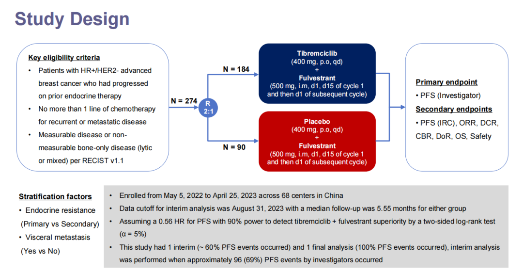 Tibremciclib(BPI-16350)是一种新型的、高度选择性的CDK4/6抑制剂,Ⅰ期临床研究已经初步证实了联合Tibremciclib联合氟维司群有较好的近期疗效和安全性。此次ESMO大会上报道的Tiffany研究,是由我和复旦大学附属肿瘤医院胡夕春教授共同牵头的、聚焦于HR+/HER2-晚期乳腺癌患者人群的Ⅲ期研究,该研究进一步评估了Tibremciclib联合氟维司群(研究组)对比单药氟维司群(对照组)在内分泌治疗后出现进展的HR+/HER2-晚期乳腺癌患者中的疗效和安全性。