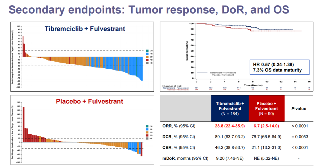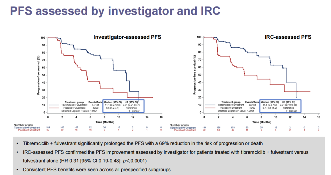 结果显示,相较于对照组,Tibremciclib联合氟维斯群治疗能够显著改善无进展生存期(PFS),经研究者评估,对照组的中位无进展生存期为5.5个月,而研究组达到了11.1个月,风险比(HR)为0.31,降低了69%的疾病进展风险,因此该研究结果提示,Tibremciclib联合氟维斯群有可能是内分泌治疗后出现进展的HR+/HER2-晚期乳腺癌患者的一种新的治疗选择。
