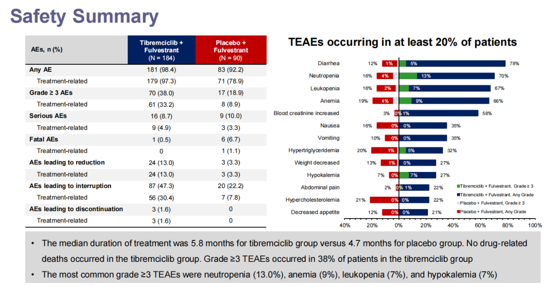 我们在Tibremciclib联合氟维司群的Ⅲ期研究也看到了一系列的不良反应,包括消化系统不良反应、血液学不良反应等,其中最为常见消化系统不良反应是腹泻,Tibremciclib联合氟维司群治疗的患者中,78%的患者会出现腹泻,但是严重腹泻(≥3级)的发生率并不高,只有5%的患者出现了≥3级腹泻。骨髓抑制(中性粒细胞减少)的发生率也相对较高(70%),但只有13%的患者出现了≥3级的中性粒细胞减少。