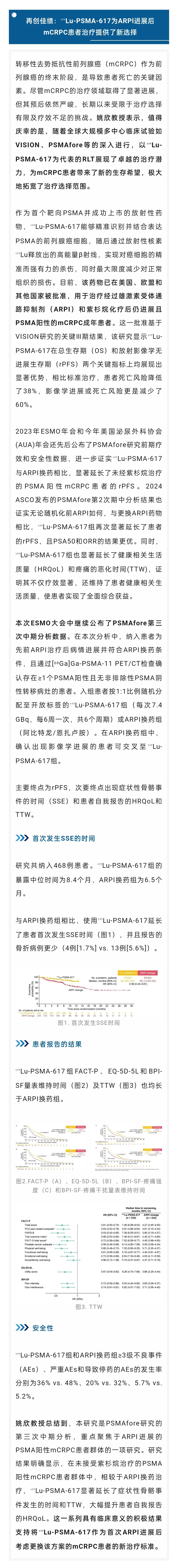 编者按:2024年9月13~17日,全球肿瘤领域的盛会之一——欧洲肿瘤内科学会(ESMO)年会于西班牙巴塞罗那召开,会上多项具有里程碑意义的临床研究结果公布,为多个瘤种领域带来诊疗重大突破。尤为引人注目的是,以177Lu-PSMA-617为代表的放射配体疗法(RLT)领域,取得了令人振奋的成就。其中,一项斩获LBA摘要(LBA66)的研究,首次深入探讨了177Lu-PSMA-617序贯多西他赛在转移性激素敏感性前列腺癌(mHSPC)患者中的治疗效果。此外,会上还展示了两项壁报研究成果,分别是PSMAfore研究的第三次期中分析的健康相关生活质量数据(摘要号:1599P)以及对血液学影响的(摘要号:1611P)数据。