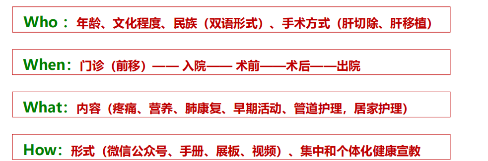 华西医院认为肝脏外科切除术健康宣教内容目的是提升患者和家属对加速康复相关知识的认知,减轻负面情绪,以获取其对围术期诊疗行为的配合,鼓励患者和家属的参与,提升围术期生活质量,所以制定的宣教内容也比较明确,主要包括“3个W,1个H”,如下图所示。