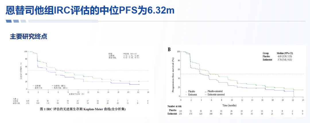 既往,一项1期研究结果提示,依西美坦联合恩替司他在HR+晚期乳腺癌患者中显示出耐受性和抗肿瘤活性[8]。中国医学科学院肿瘤医院徐兵河院士团队开展的Ⅲ期临床试验(EOC103A3101)则进一步验证了恩替司他在中国乳腺癌患者中的疗效和安全性[9]。研究结果显示,恩替司他联合依西美坦治疗的中位PFS显著长于安慰剂组(6.32 vs.3.72个月),降低了24%的疾病进展或死亡风险(HR 0.76,P=0.046)。