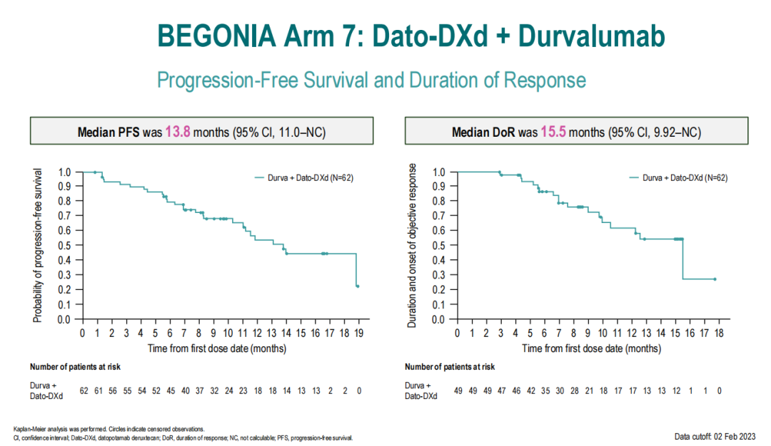 此外,针对Trop-2靶点的另一ADC药物Dato-Dxd,既往公布的TROPION-PanTumor01研究显示Dato-Dxd后线治疗晚期三阴性乳腺癌有肯定的疗效;2023年ESMO大会上公布的BEGONIA Ib/II期研究中队列7的数据显示,Dato-DXd联合度伐利尤单抗一线治疗晚期三阴性乳腺癌患者的ORR为79%(95CI:66.8~88.3),中位PFS为13.8个月(95%CI:11.0~NC),中位DoR为15.5个月(95%CI:9.92~NC),结果非常令人鼓舞,也让我们看到一线治疗中,ADC类药物+免疫治疗前景广阔。尽管2024年Dato-Dxd在晚期三阴性乳腺癌治疗领域未公布新的结果,但未来数据仍值得我们期待。