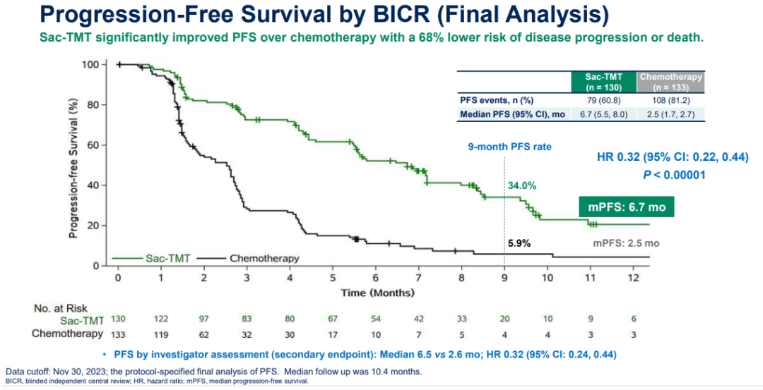 张频教授:目前针对三阴性乳腺癌的ADC药物分为HER2和Trop-2两个靶点。Trop-2 ADC大家都熟知戈沙妥珠单抗,它是第一个获批针对Trop-2靶点的ADC药物。在ASCENT III期研究中,戈沙妥珠单抗与医生选择的化疗(TPC)相比,对既往接受过至少二线化疗的晚期三阴性乳腺癌患者展示出了PFS和OS获益。戈沙妥珠单抗组的中位无进展生存期(mPFS)为4.8个月,中位总生存期(mOS)为11.8个月,而TPC组mPFS仅为1.7个月(HR=0.41),mOS为6.9个月(HR=0.51)。虽然该研究中戈沙妥珠单抗相较于TPC组取得了一定生存获益,但是我们仍然需要更多疗效更好的药物。