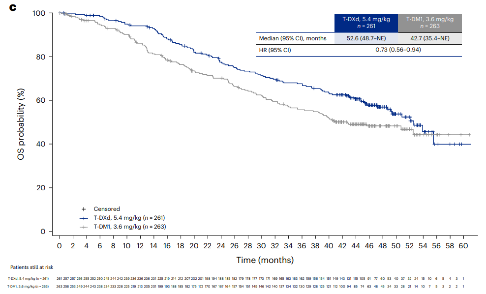 如此出色的ORR和PFS,使大家对DB-03研究的OS充满期待。2024年ASCO大会报道的该研究的OS结果显示,T-DXd的中位OS长达52.6个月,相较于对照组(42.7个月)延长了近1年,死亡风险降低27%(HR 0.73)[3]