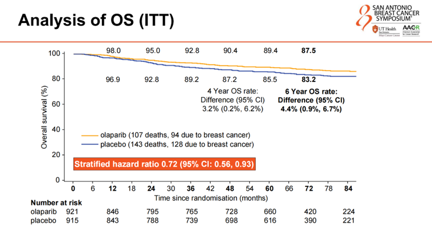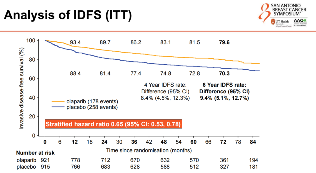 △奥拉帕利组的6年IDFS率达到79.6%,安慰剂组为70.3%,绝对获益9.4%。