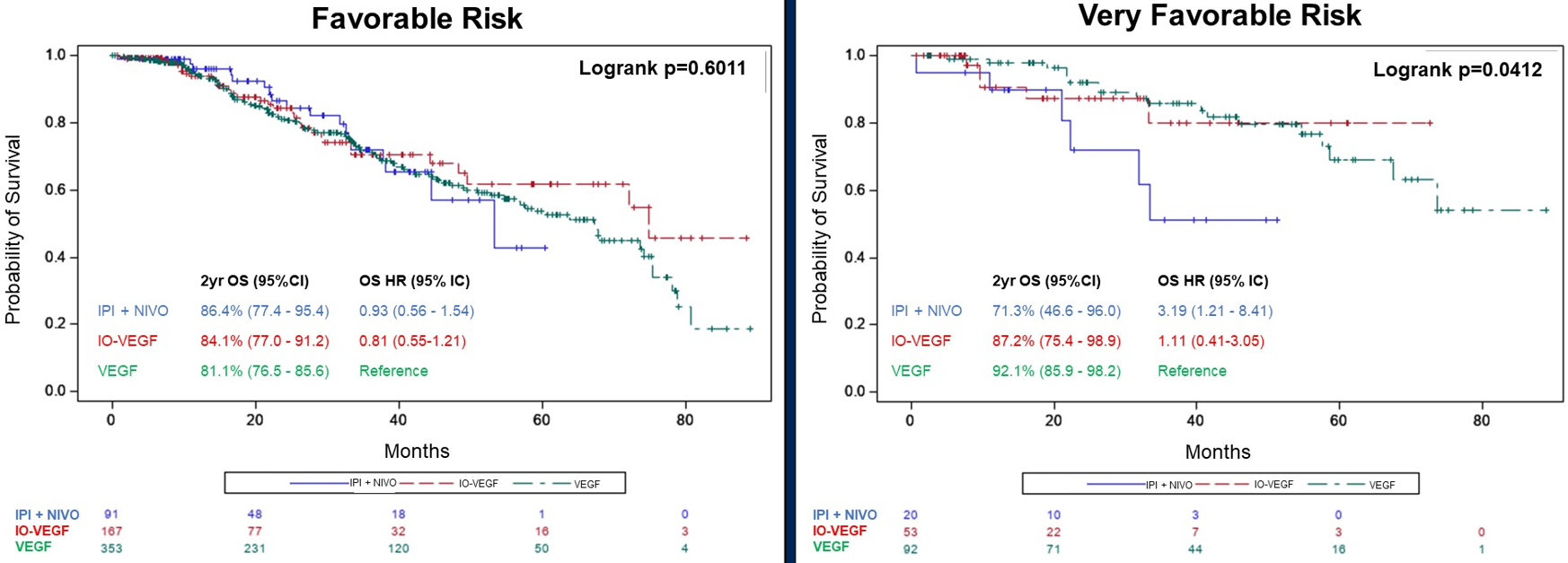 2024 ASCO年会公布了一项IMDC真实世界研究[5],该研究从传统意义的低危患者中筛选出极低危患者,其标准定位为从初诊至接受全身治疗的时间≥3年、无脑肝或骨转移、卡氏评分90或100的患者。数据分析显示,IMDC极低危人群接受双免疫、靶向联合免疫以及单独靶向治疗的ORR分别为23.5%、58.1%和55%,2年OS率分别为71.3%、87.2%和92.1%;而低危患者的ORR分别为35%、51.4%和37.9%,2年OS率分别为86.4%、84.1%和81.1%。这表明极低危患者仍然能从单独抗血管靶向药物治疗中获益,而非极低危患者似乎从联合免疫治疗中更能获益。该结果仍然需要进一步的前瞻性试验和更长时间的随访来验证,但对于生物学行为较差的患者,即使是低危患者,仍然可以考虑积极的免疫联合治疗。