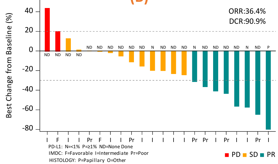 在另一项特异性双抗的研究中[16],22例非透明细胞肾细胞癌患者接受一线PM8002/BNT327治疗,中位随访9.0个月,ORR为36.4%。不同亚型中,乳头状癌ORR最高,DCR为90.9%,中位PFS为15.1个月。此外,研究中对于双抗药物的3级以上不良反应发生率更低(41.5%,KEYNOTE-426研究为75.8%),表现出了很好的发展前景。
