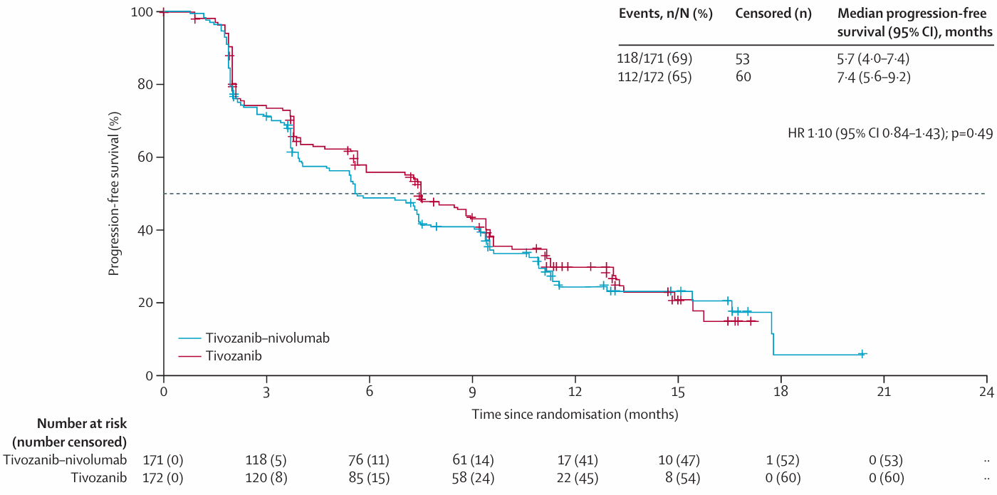 TiNivo-2研究是一项全球多中心、随机、开放标签的3期研究[8],分析了纳武利尤单抗联合替沃扎尼或替沃扎尼单药治疗经1~2种治疗(包括免疫治疗)后出现进展患者的疗效。主要终点是PFS;关键次要终点是OS,其他次要终点包括PFS、ORR、DoR和安全性/耐受性。研究共纳入343名患者,随机接受替沃扎尼联合纳武利尤单抗(n=171)或替沃扎尼(n=172)。研究结果表明,联合治疗组和单药组的PFS分别为5.7个月和7.4个月,OS分别为17.7个月和22.1个月。两组ORR接近,分别为33%和34%。结果提示,对于晚期肾细胞癌患者,不推荐再次尝试ICI治疗。此外,研究数据明确指出,在免疫治疗后,替沃扎尼单药治疗展现出了一定的疗效,为这一阶段的患者提供了潜在的治疗选择。因此,对于晚期肾透明细胞癌一线接受免疫联合后的治疗,继续免疫联合靶向药物不能获益,而选择单独靶向治疗已经成为共识。