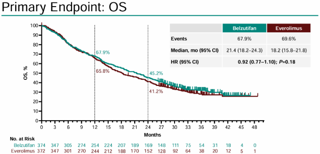 贝组替凡单药对比依维莫司的LITESPARK-005研究共入组746名患者(贝组替凡374名,依维莫司372名)。既往数据证实,贝组替凡可显著改善免疫检查点抑制剂和抗血管生成药物治疗后进展的晚期ccRCC患者的无进展生存期(HR 0.75,P<0.001)和客观缓解率(21.9%vs.3.5%,P<0.00001),而依维莫司则未达到该水平。2024年ESMO大会更新PFS获益,并公布了OS结果[9]。与依维莫司相比,贝组替凡持续具有PFS获益(5.6个月vs.5.6个月;HR 0.75;95%CI 0.63~0.88);贝组替凡的12个月和24个月估计PFS率更优(12个月:33.7%vs 17.6%;24个月:17.5%vs 4.1%)。贝祖替凡治疗组的中位OS为21.4个月,依维莫司组为18.2个月(HR 0.92;95%CI 0.77~1.10;P=0.18)。12个月时估计OS率分别为67.9%vs.65.8%,24个月时估计OS率分别为45.2%vs.41.2%。结果表明,与接受依维莫司治疗相比,接受贝组替凡治疗的晚期ccRCC患者可获得更好的PFS和ORR结局。