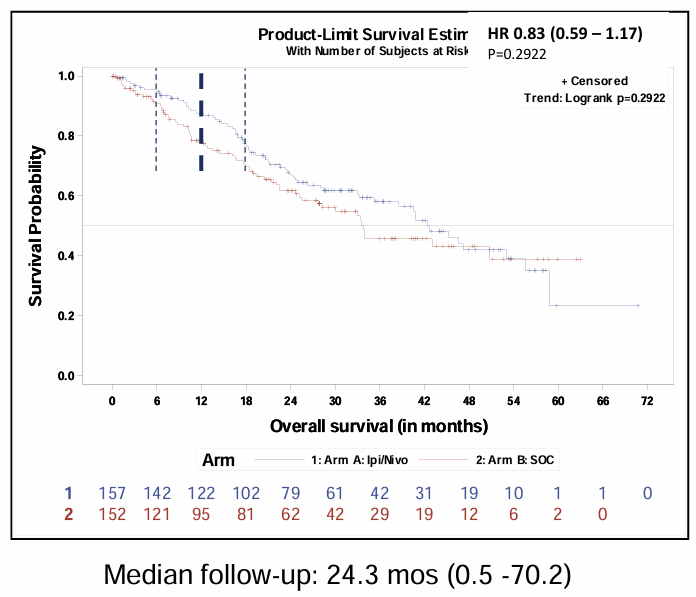 虽然JAVELIN RENAL100研究显示,阿昔替尼联合阿维鲁单抗显著改善一线治疗的无进展生存(PFS)时间,并由此获批美国FDA晚期肾癌一线治疗适应证。但2024 ASCO年会所公布的最终生存分析结果显示[1],经过68个月的中位随访时间后,联合治疗在PD-L1阳性患者中的中位总生存(mOS)为43.2个月(对照组为36.2个月,HR=0.86);在意向性治疗(ITT)人群中的mOS为44.8个月(对照组为38.9个月,HR=0.88)。尽管联合治疗可以延长总生存期近7个月,但是仍没有达到统计学显著性界值,为靶向联合PD-L1单抗的应用埋下了阴霾。