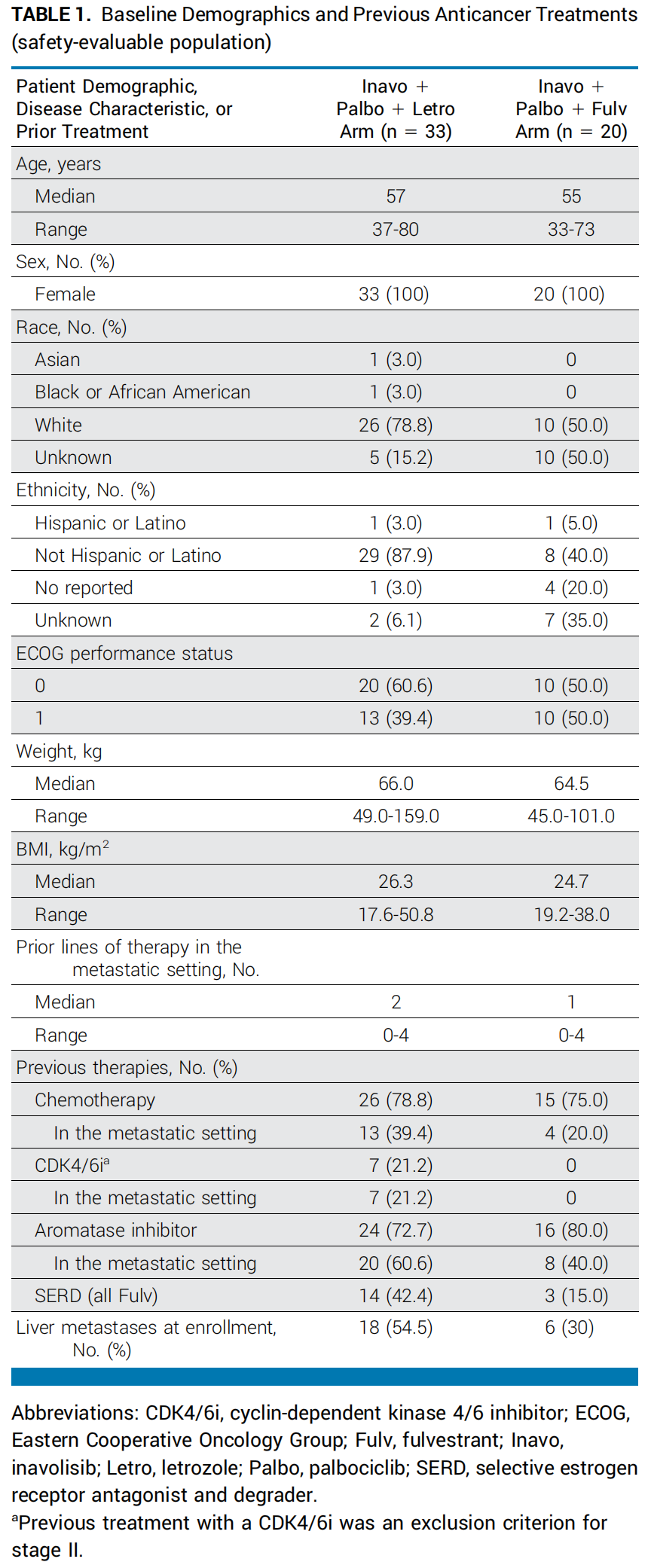 研究纳入了年龄≥18岁且携带PIK3CA突变的肿瘤患者。分别接受伊那利塞、哌柏西利和来曲唑(Inavo+Palbo+Letro组;来曲唑组)/氟维司群(Inavo+Palbo+Fulv组;氟维司群组)治疗,直至出现不可接受的毒性或疾病进展。评估来曲唑组在I期和II期剂量扩展阶段采用了3+1+3的剂量递增设计;而评估氟维司群组则在进行II期剂量扩展前设置了一个安全性导入期。