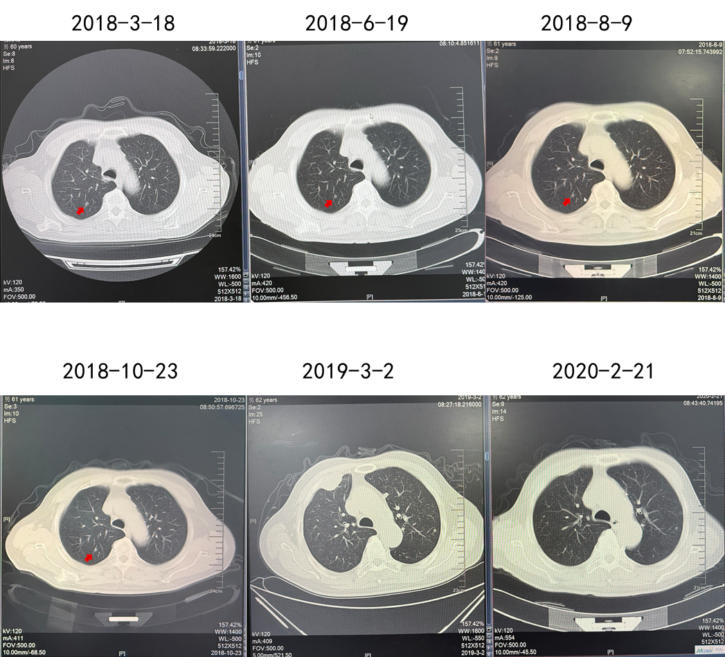 疗效:肺部病灶疾病稳定(4年)。对侧肾上腺病灶部分缓解(4年)。