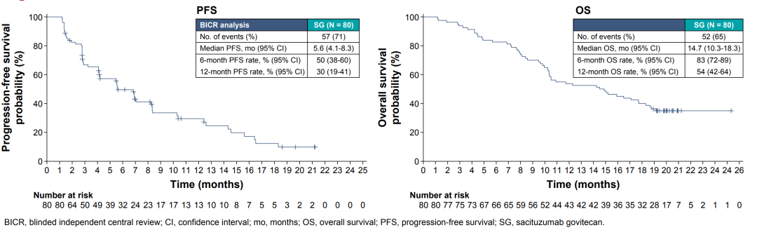 国内方面、由徐兵河院士所牵头开展的EVER-132-001研究,验证了中国人群一致的疗效获益和安全性。该研究纳入了与ASCENT临床研究非常类似的人群,mPFS为5.6个月,mOS达到14.7个月,与ASCENT临床研究的表现高度一致[4]