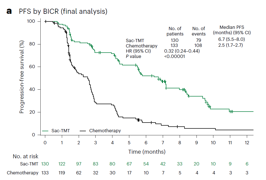 该研究为一项国内多中心、随机、对照的Ⅲ期研究,主要针对既往接受过至少二线标准化疗方案治疗,并且要求为紫杉类药物治疗失败的TNBC患者。研究共入组了263例患者,按1:1随机分为芦康沙妥珠单抗组和医生选择的化疗方案(TPC)组。中位随访10.4个月显示,芦康沙妥珠单抗组较TPC组显著延长中位无进展生存期(PFS),为6.7个月vs 2.5个月(HR 0.32,95%CI:0.24-0.44,P<0.00001),显著降低了68%的疾病进展或死亡风险,且无论TROP2表达水平、既往治疗线数、是否为PD-1/PD-L1经治、HER2表达状态如何,患者均能从芦康沙妥珠单抗治疗组取得更好的获益。