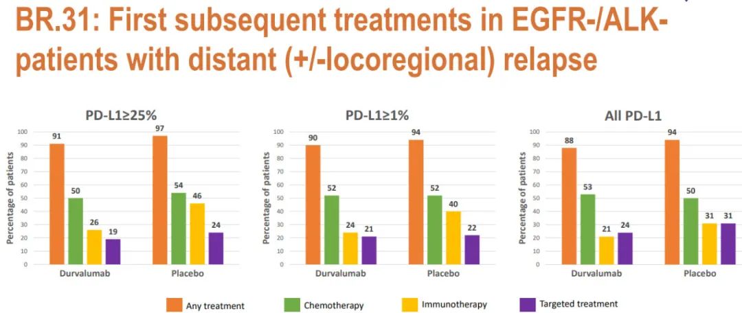 Dr.Westeel:I just presented the results of the BR.31 trial that was conducted by ten international academic groups.It compared adjuvant durvalumab for one year to placebo in patients with completely resected stage IB-IIIA NSCLC.The primary results of this trial were presented at ESMO last year.What I have presented is the incidence of relapses of primary cancers and subsequent treatments.Just to remind you,last year when we presented at ESMO,the disease-free survival was presented and there was no difference between both arms in terms of disease-free survival regardless of PD-L1.What I presented today is that there was no difference in terms of incidence of recurrences,and there was no difference either in terms of the incidence of second primaries.Recurrences were diagnosed in around 40%of patients in both arms,and the second primary cancers between 5%and 8%of patients.In terms of treatment,there was a difference which was anticipated.Patients who were in the placebo arm who had a recurrence were more often treated with immunotherapy.That makes sense.