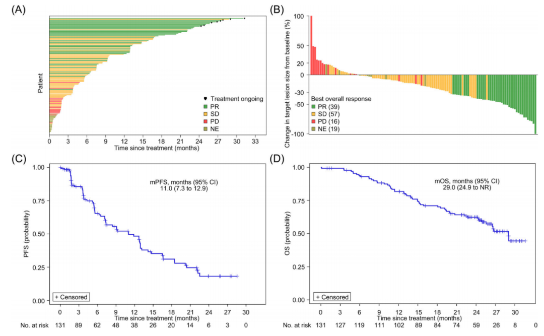 安全性方面,在数据截止时,吡洛西利的中位暴露持续时间为360天,安慰剂的中位暴露持续时间为223天。吡洛西利的中位相对剂量强度为90.55%,安慰剂为98.80%。在吡洛西利组中,最常见的治疗期间不良事件(TEAE)为腹泻、中性粒细胞计数降低、白细胞计数降低和贫血。大多数AE的严重程度为1级或2级,可通过对症治疗、暂停用药或下调剂量好转或痊愈。共有86名患者(42.2%)由于发生TEAE导致吡洛西利减量,8例患者(3.9%)因AE永久停用吡洛西利。