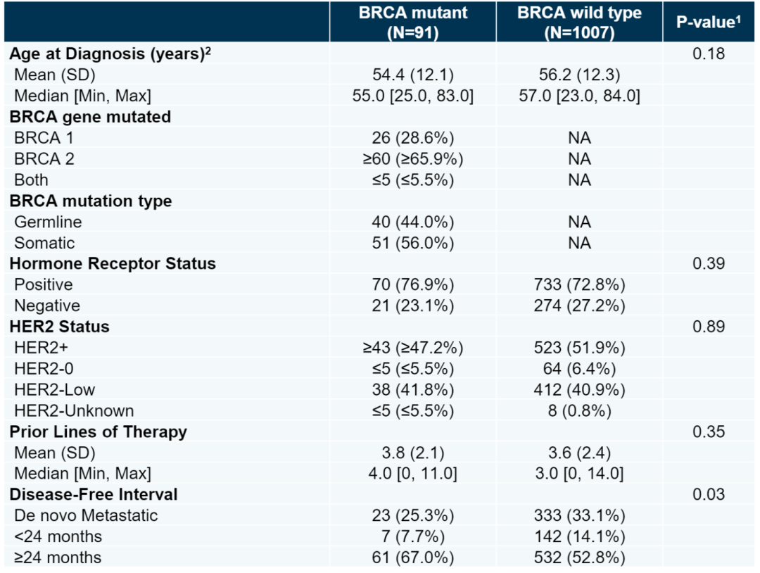 该研究利用美国Flatiron Health电子健康数据,回顾性纳入了1098例接受T-DXd治疗的晚期乳腺癌患者,这些患者的既往中位治疗线数为3,其中有近一半为HER2+,有8.3%携带BRCA突变。