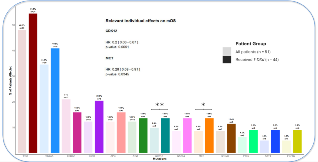 这项基于ctDNA的生物标志物分析显示,携带CDK12突变的HER2+mBC患者与更好的OS相关,尤其是接受T-DXd治疗的患者。这些结果表明CDK12突变可能在耐药和敏感性机制中发挥关键作用,从而影响T-DXd治疗效果,并为未来的新治疗策略提供见解。