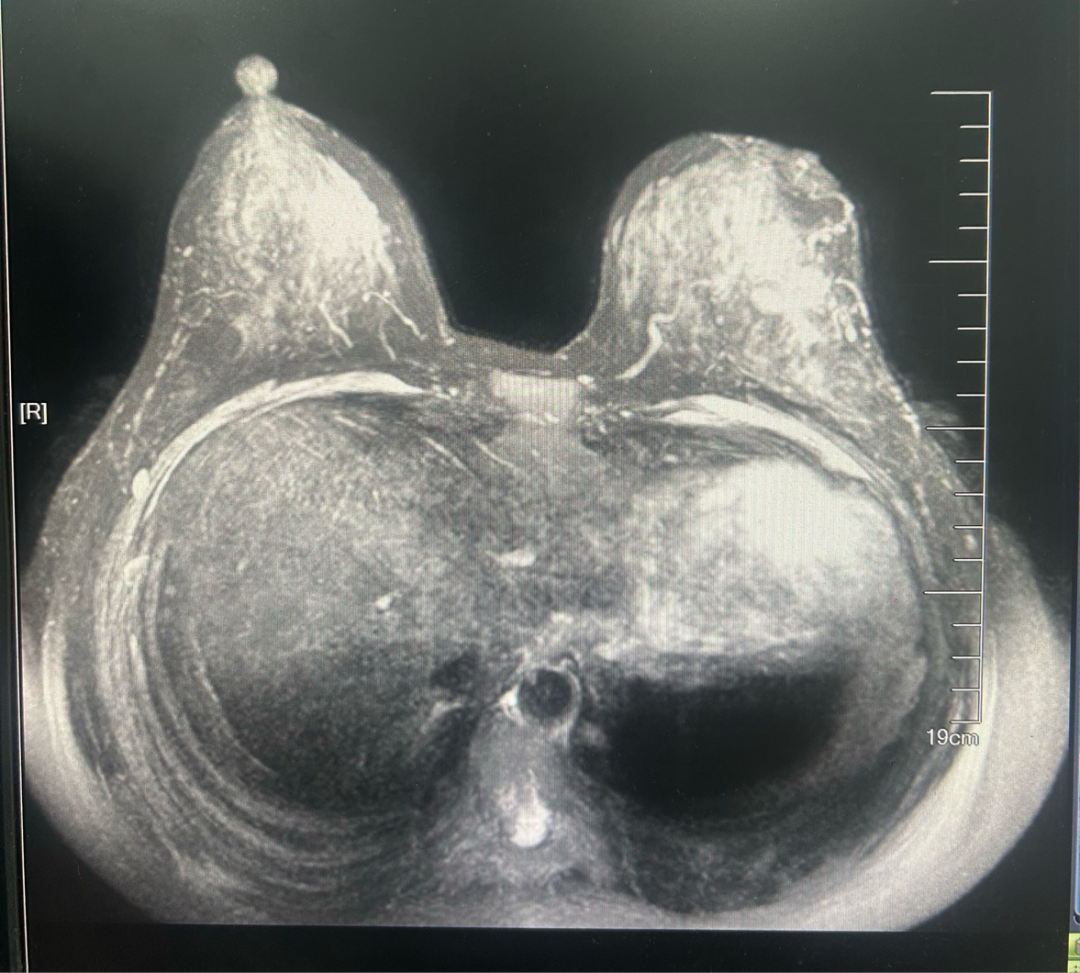 3、右乳外份条带样异常信号,硬化性腺病与其他待鉴别,必要时活检。(BI-RADS 4A)