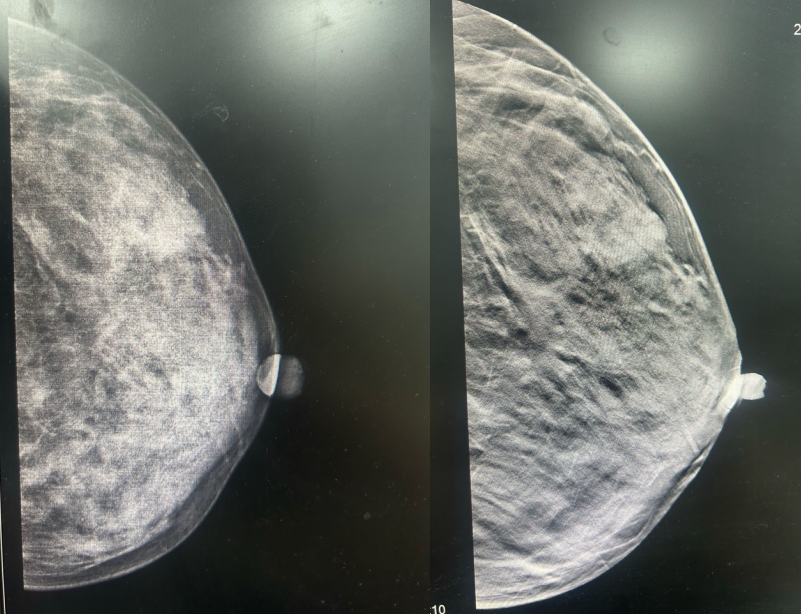 2、右乳外上象限中后带局限性非对称致密,建议进一步检查。(BI-RADS 0)
