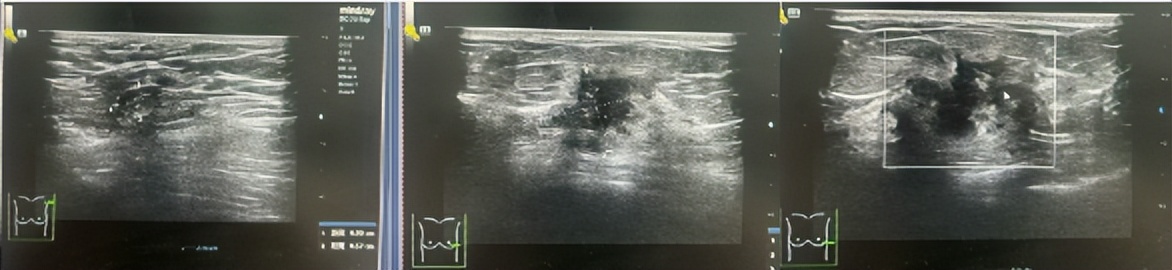1、左乳外下象限前中带肿块,恶性可能。(BI-RADS 4C)