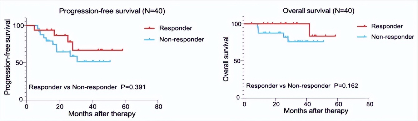中位随访时间为32.2个月(IQR:27.0~35.5个月)。1年无进展生存率(PFS)为87.5%(95%CI:72.4%~95.3%)。与治疗无反应者相比,治疗反应者的中位PFS(P=0.16)和总生存期(OS,P=0.39)相似。