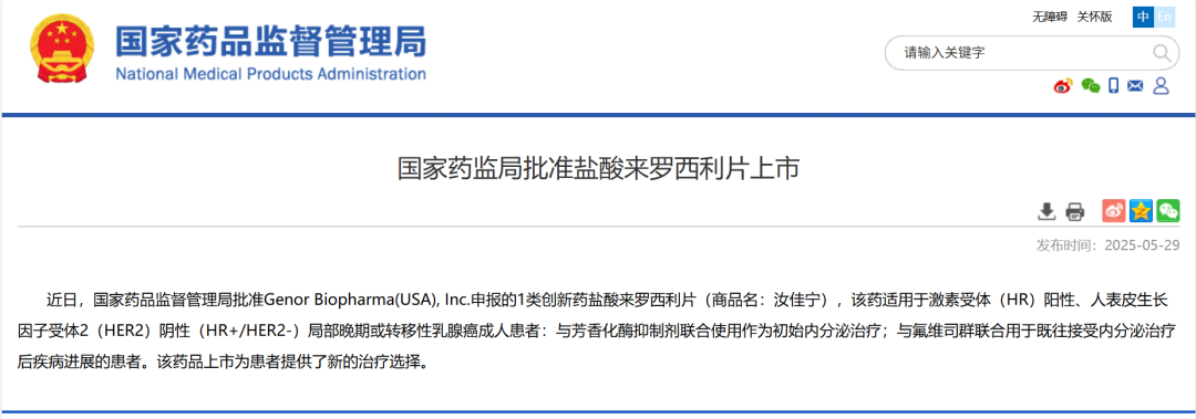 2025年5月29日,新型CDK4/6i来罗西利经NMPA批准,用于HR+/HER2-局部晚期或转移性乳腺癌成人患者的一线&二线治疗: