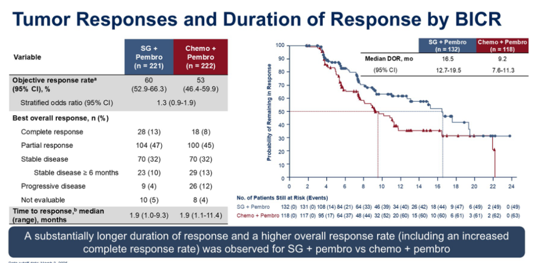SG/pembro在其他疗效指标上也显示出数值上的改善,包括中位缓解持续时间(16.5个月vs 9.2个月)和客观缓解率(60%vs 53%;分层优势比1.3,95%CI:0.9-1.9)。