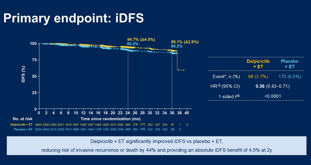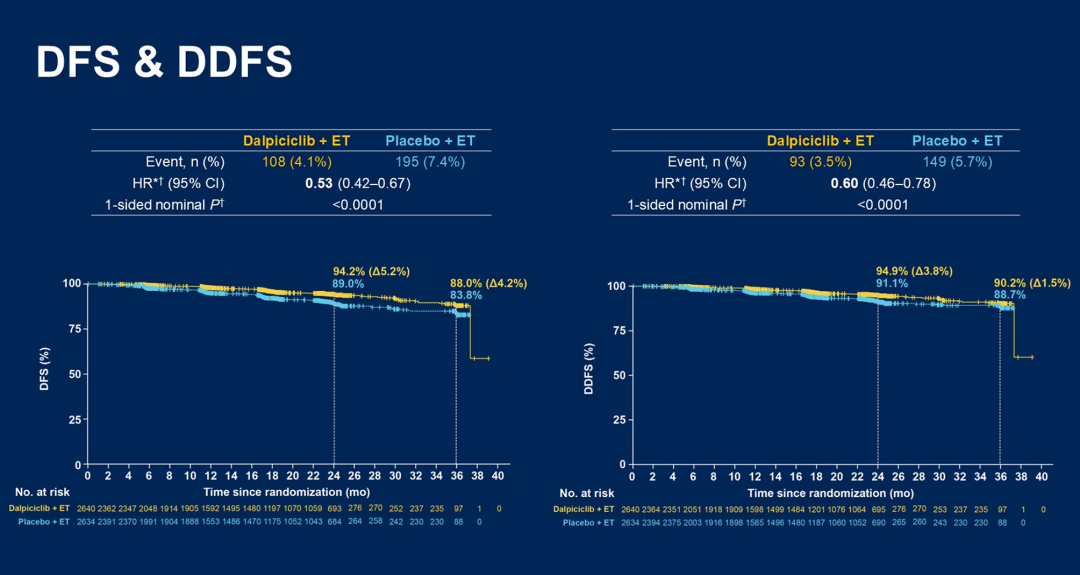 研究结果显示达到了主要终点,达尔西利组的2年IDFS率提高4.5%(94.7%vs 90.2%;HR 0.56,95%CI:0.43~0.71,P<0.0001),且不同亚组获益趋势一致。DFS(HR 0.53,2年提高5.2%)和无远处转移生存期(DDFS,HR 0.60,2年提高3.8%)也显示达尔西利组获益。达尔西利的治疗安全性和耐受性尚可,两组药物导致的停药(2.1%vs 0.8%)和严重不良事件(3.7%vs 1.5%)发生率相当。DAWNA-A研究为达尔西利用于高危HR+/HER2-乳腺癌辅助治疗提供高质量循证医学证据,也为中国乳腺癌患者提供了新的CDK4/6i辅助治疗选择。
