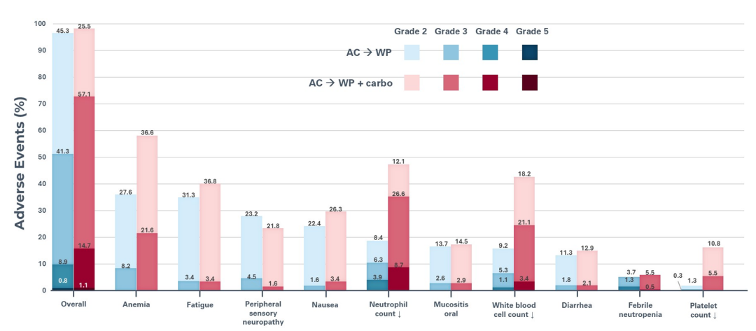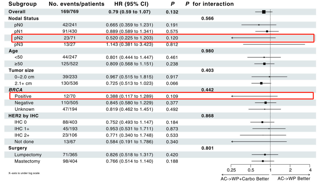 需注意的是,该研究中AC-wP+Carbo方案显著增加了毒副作用,≥3级不良事件发生率达72.9%(对照组为51.1%),如果采用剂量密集方案是否能够降低不良反应发生率从而改善治疗获益,未来值得探讨。此外,个别亚组也显示了一定的获益趋势,如pN2(HR 0.52)和BRCA突变(HR 0.388),可进一步筛选和验证优势获益人群。