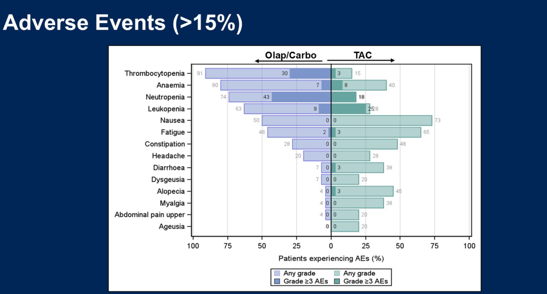 本次ASCO大会同场报道的II期ABCSG 45研究[3]也部分验证了这一点。该研究针对HRD阳性的早期TNBC患者,分别使用传统化疗(TAC)或卡铂+PAPR抑制剂新辅助治疗,结果显示尽管总体人群和BRCA野生型患者中,TAC组的RCB0/I率和pCR率均高于卡铂组,但在BRCA突变患者中,卡铂组的RCB0/I率(77.3%vs 65.0%)和pCR率(77.3%vs 65.0%)在数值上有所提升;此外,卡铂组显示更高的血液毒性,但非血液毒性更低,可见血液毒性仍是卡铂临床应用和管理的重要问题。