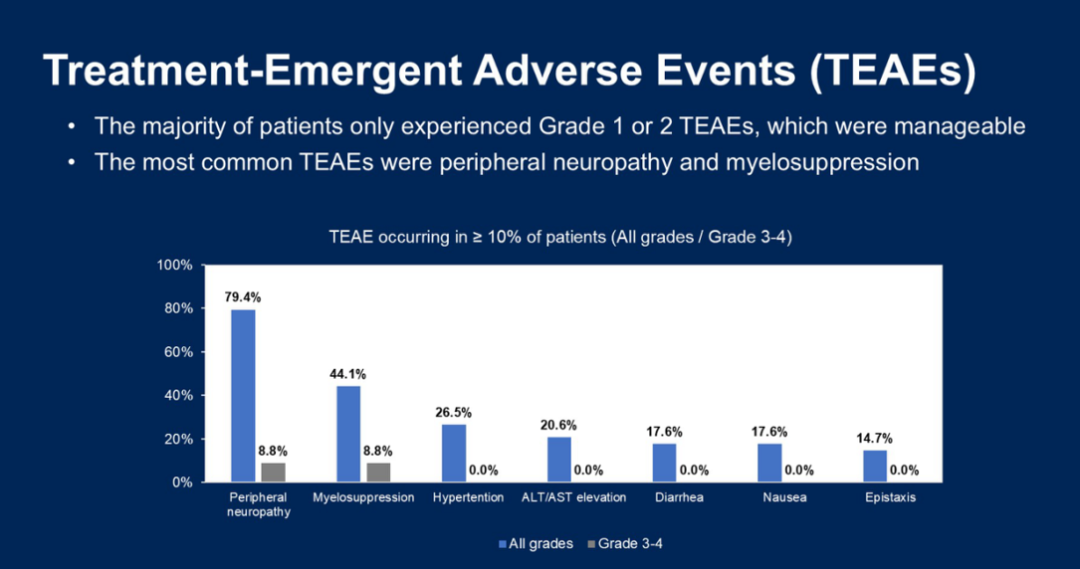 患者主要不良反应为周围神经病变,其中3级(主要为感觉型)占8.8%(3/34)。大多数治疗相关不良反应为1级或2级,被认为可控且可逆。