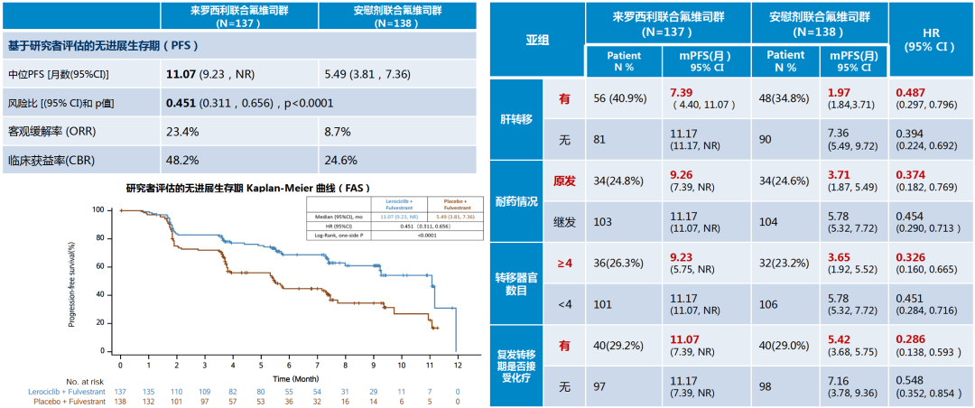 首先,主要终点研究者(INV)评估的无进展生存期(PFS)分析显示,来罗西利+氟维司群组的中位PFS是安慰剂联合氟维司群组的2倍,两组中位PFS分别为11.07个月和5.49个月,HR仅为0.451(95%CI:0.311~0.656,P<0.0001);盲法独立评审委员会(BIRC)评估的PFS也显示一致的获益趋势(11.93 vs 5.73个月,HR 0.353,95%CI:0.228~0.547,P<0.0001)。而且不同亚组均可从来罗西利+氟维司群治疗中获得一致的PFS获益,尤其是肝转移(HR 0.487)、原发耐药(HR 0.374)、高肿瘤负荷(转移器官数目≥4)(HR 0.326)、复发转移期接受过1L化疗(HR 0.286)等难治性患者,PFS获益幅度非常显著。