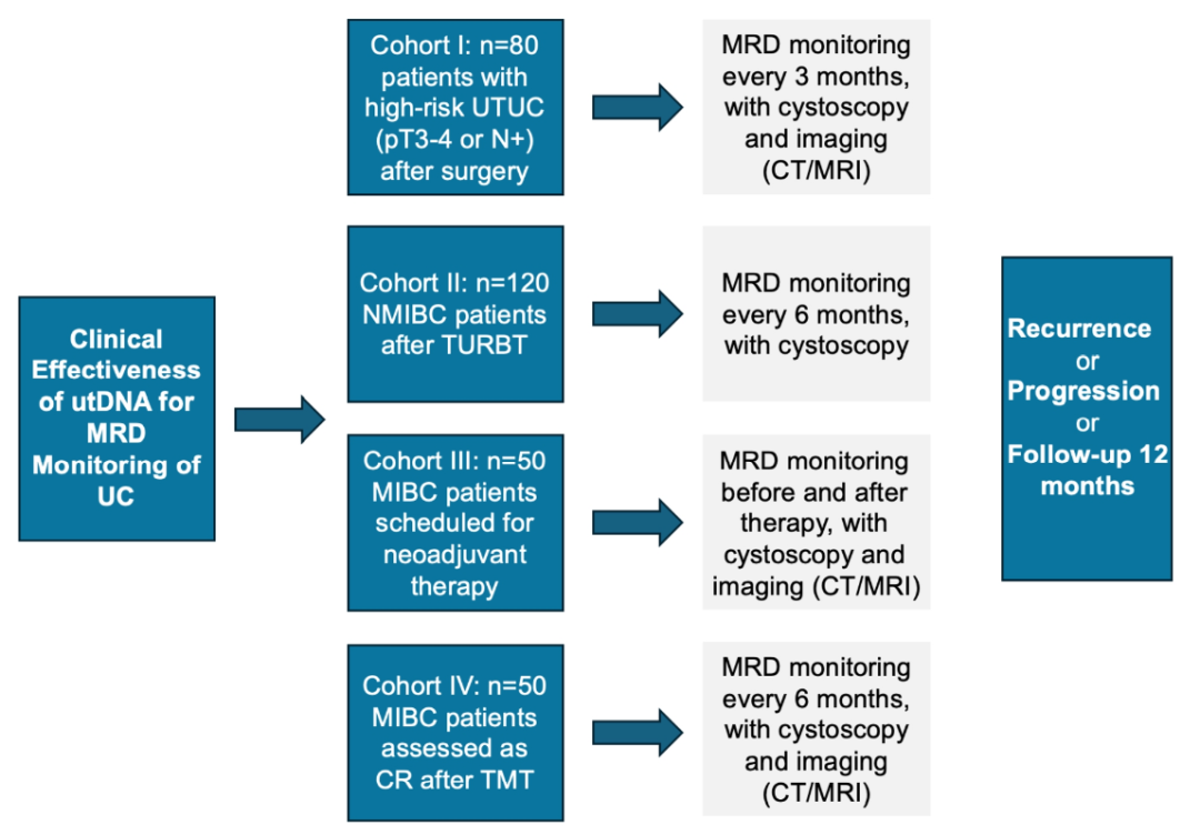 何志嵩教授:在尿路上皮癌领域,如何实现早期诊断,以及在治疗后如何评估疗效和早期发现复发,一直是临床上尚未解决的问题,也是我们的一个痛点。实际上,国内现代学者在基于尿液的检测方面已经开展了一系列出色的工作。这包括甲基化检测,以及我们团队在今年会议上报告的尿液DNA最小残存疾病(MRD)相关研究。该研究对患者尿液进行DNA测序(ucfDNA,uexDNA)并得到的MRD评分,与当前“金标准”膀胱镜±活检/影像学(CT/MRI)进行比较。研究计划入组400例尿路上皮癌患者,分为4个队列:(1)Cohort 1,高危UTUC(pT3-4/N+)术后患者;(2)Cohort 2,TURBt术后的NMIBC患者;(3)拟接受新辅助治疗的MIBC患者;(4)标准“保膀胱”三联疗法(TMT)后完全缓解(CR)的患者。