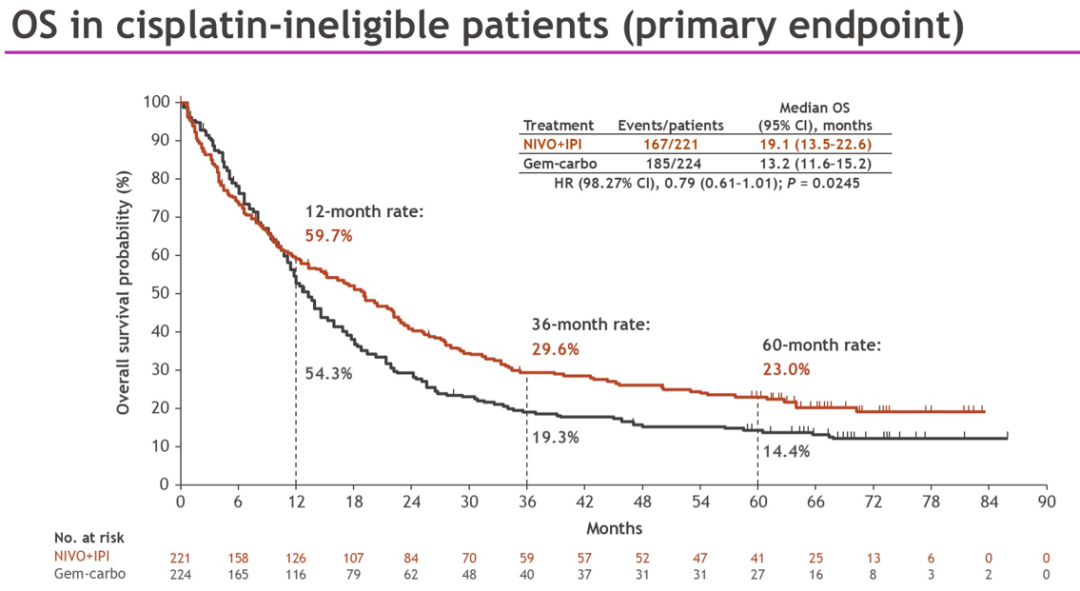CheckMate-901的早期结果表明,对于肿瘤细胞表达PD-L1≥1%的患者,与吉西他滨联合铂类化疗相比,纳武利尤单抗联合伊匹木单抗并未改善OS(HR 0.87;P=0.364;P值界值为0.0252)。在van der Heijden报告的一组不适合顺铂治疗的患者中,OS的HR为0.79(P=0.0245;P值界值为0.0173),中位随访时间为69个月。