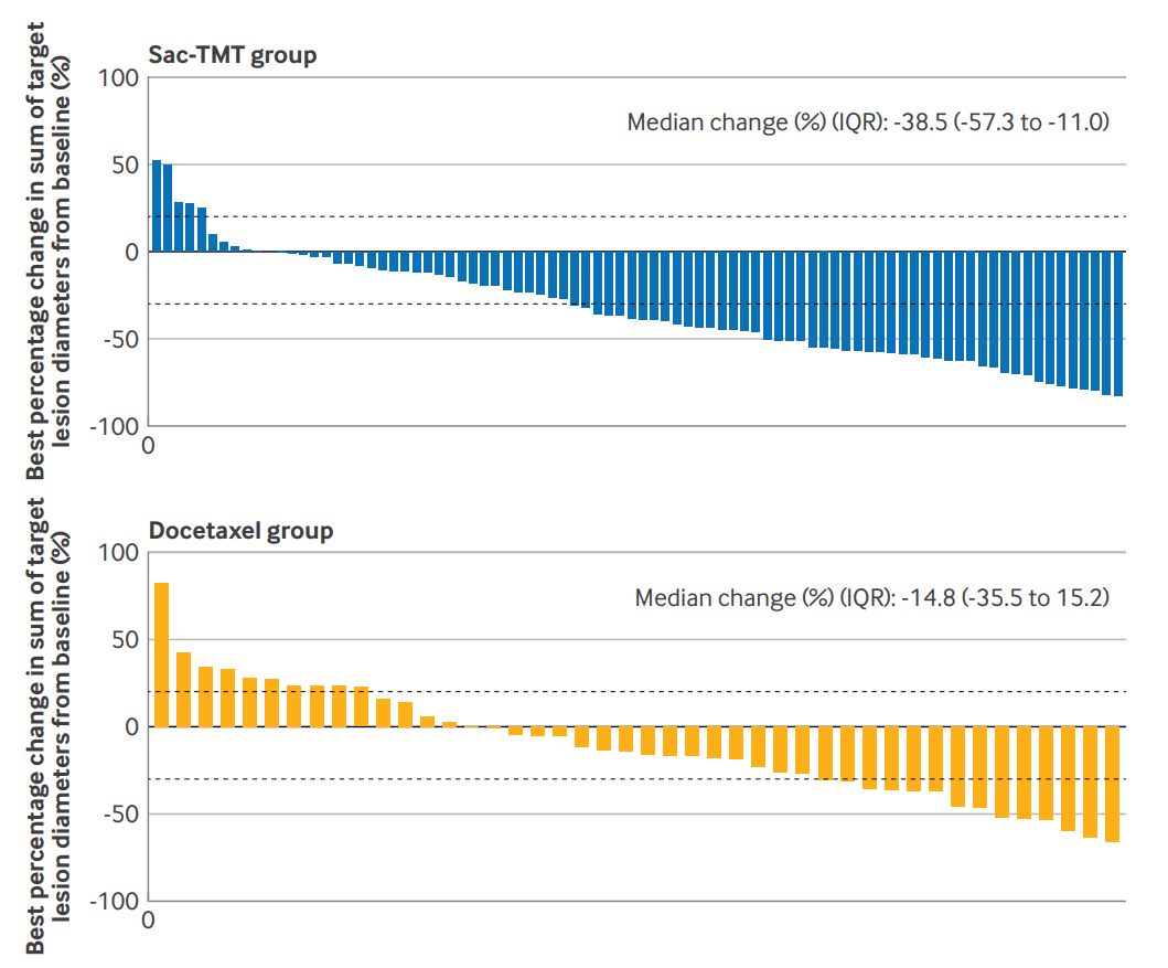 BIRC评估芦康沙妥珠单抗组和多西他赛组的ORR分别为45%(41/91)和16%(7/45),差异为29%(95%CI:15%~43%;单侧P<0.001)。