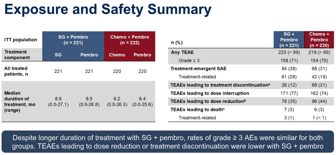 我们较为关心的另一个问题是ADC联合免疫是否增加毒副作用。从ASCENT-04研究来看,两组的≥3级治疗期间不良事件(TEAE)发生率一致(71%vs 70%),而且SG组的停药率仅为化疗组的三分之一(12%vs 31%),显示了更好的治疗耐受性。此外,针对临床所关注的ADC或免疫治疗相关的特殊不良事件,该研究均观察到与化疗组相当水平的发生率,且没有增加新的安全性事件。