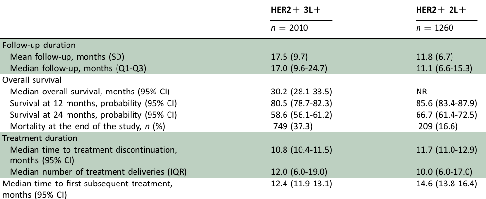 对于HER2+3L患者人群,中位至治疗停止时间(TTD)为10.8个月(95%CI 10.4-11.5个月);对于HER2+2L患者人群,中位TTD为11.7个月(95%CI 11.0-12.9个月)。