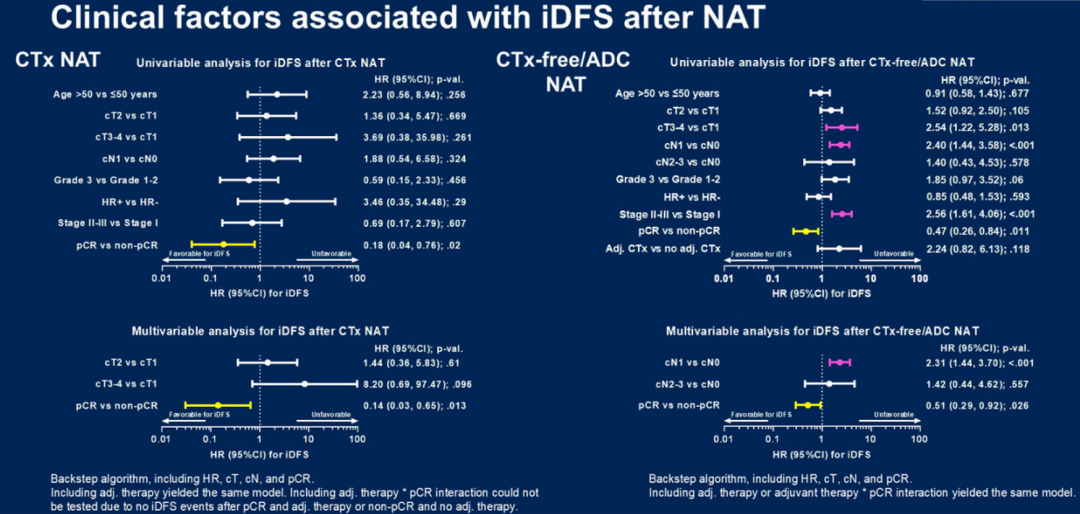 单变量分析显示,在CTx组中,iDFS与pCR(HR 0.18;95%CI:0.04-0.76)相关,在CTx-free的NAT组中,iDFS与cT(3-4 vs 1:HR 2.54;95%CI:1.22-5.28)和cN分期(cN1+vs cN-:HR 2.40;95%CI:1.44-3.58)、组织学分级(3 vs 1-2:HR 1.85;95%CI:0.:97,3.52)及pCR(HR 0.47;95%CI:0.26-0.84)相关。