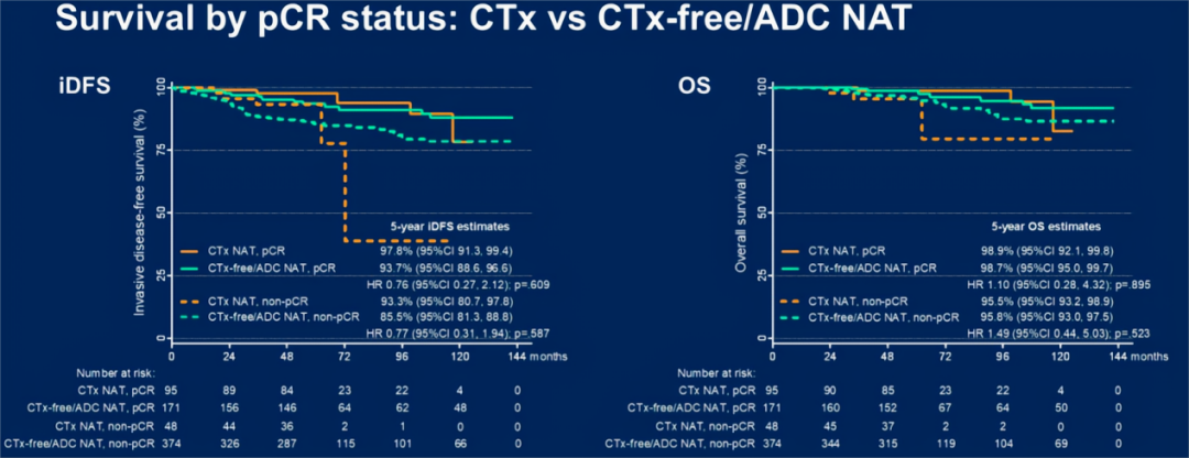 CTx组和CTx-free/ADC NAT组分别有95名(66%)和171名(31%)患者达到pCR。CTx组有5名(5%)pCR患者和5名(10%)non-pCR患者发生iDFS事件,而CTx-free/ADC NAT组,分别有14名(8%)pCR患者和59名(16%)non-pCR患者发生iDFS事件。CTx组pCR患者5年iDFS率为97.8%(95%CI:91.3-99.4),CTx-free/ADC NAT组为93.7%(95%CI:88.6-96.6)(HR 0.76;95%CI:0.27-2.12,P=0.609)。