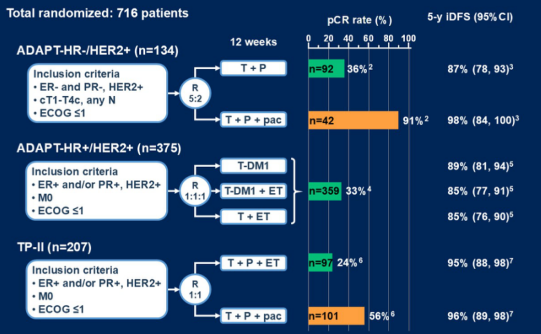 目前,HER2+eBC的降阶治疗策略旨在通过减少或完全省略全身化疗(CTx)来减轻急性和晚期毒性。该研究组在三项随机降阶试验中分析了HER2+eBC的治疗方案中CTx(紫杉醇,pac)-free的短期(12周)新辅助治疗(NAT)的结果和生存预测因素。