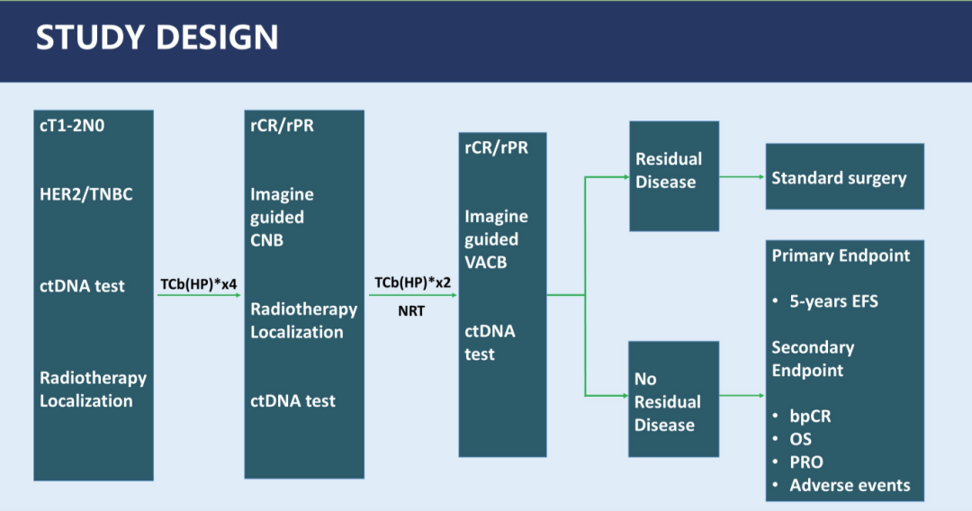 本研究旨在评估通过真空辅助核心活检(VACB)确认达到pCR的患者,省略手术后其5年无事件生存率(EFS)是否不劣于标准手术。截至目前,该研究已入组4例患者。我们期望通过该研究取得阳性结果后,能够大大减轻对新辅助治疗敏感的三阴性/HER2+乳腺癌患者在达到pCR后的治疗负担。