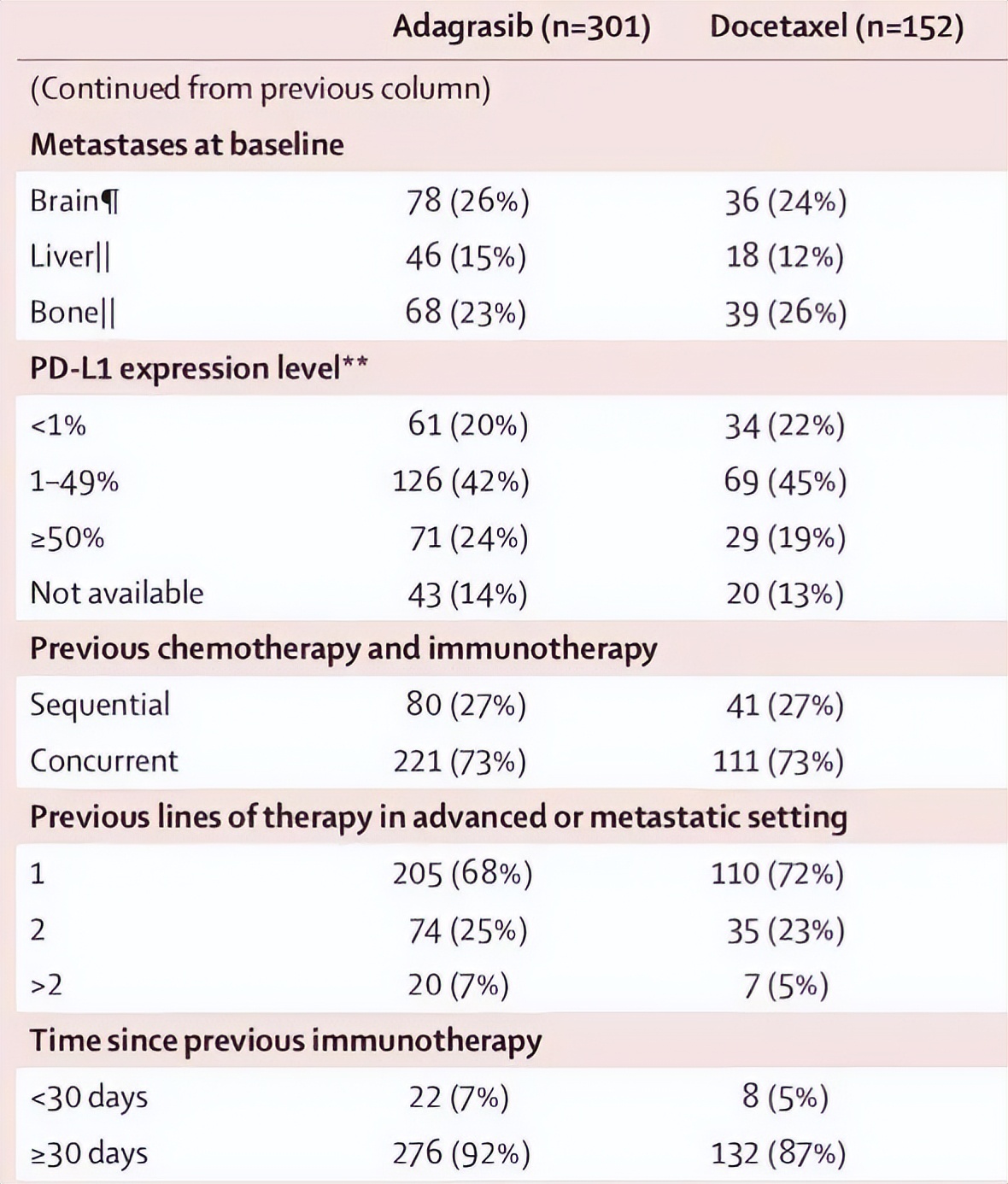研究结果:从2021年2月至2023年11月,共计453例患者随机,adagrasib组和多西他赛组分别有301例和152例患者入组,两组基线特点均衡可比,转移患者占比分别为94%和95%,其中脑转移占比分别为26%和24%,PD-L1<1%、1~49%和≥50%的患者,占比分别为20%vs.22%,42%vs.45%,24%vs.19%,既往接受一线治疗患者占比分别为68%和72%,二线占比分别为25%和23%,三线及以上占比分别为7%和5%。