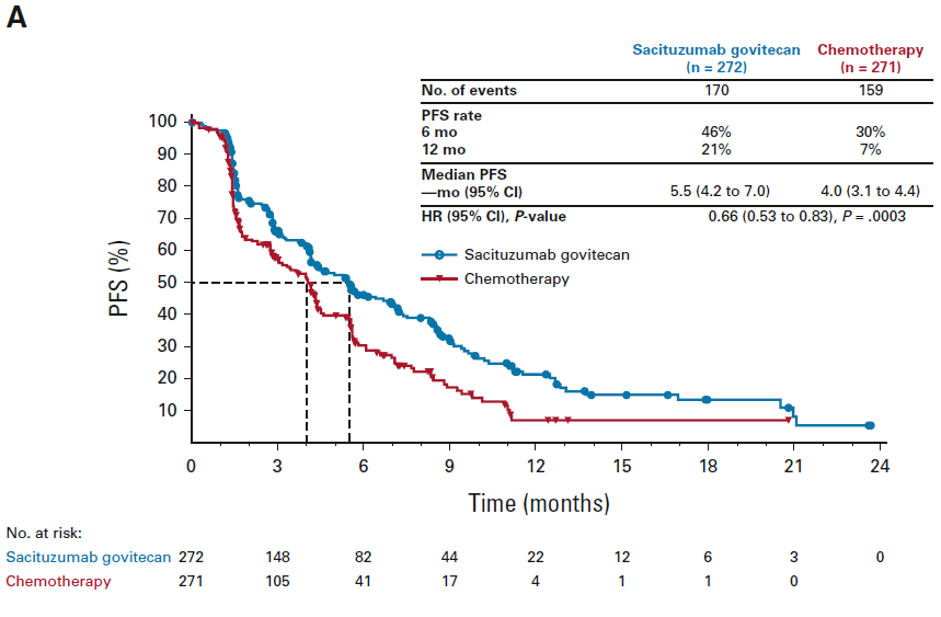 [4]Hope S.Rugo et al.Primary results from TROPiCS-02:A randomized phase 3 study of sacituzumab govitecan(SG)versus treatment of physician’s choice(TPC)in patients(Pts)with hormone receptor–positive/HER2-negative(HR+/HER2-)advanced breast cancer..JCO 40,LBA1001-LBA1001(2022).