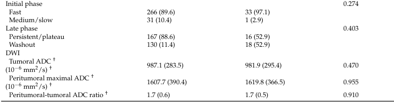 MRI特征方面,复发组与未复发组的弥散加权成像(DWI)特征(ADC值等)差异均无统计学意义,背景实质强化(BPE)、肿块形态、肿块边缘、非肿块强化(NME)、内部强化、早期及晚期动力学曲线类型在两组间差异均无统计学意义。