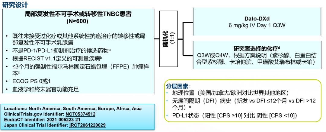 [11]Schmid P,Oliveira M,O’Shaughnessy J,et al.TROPION-Breast05:a randomized phase III study of Dato-DXd with or without durvalumab versus chemotherapy plus pembrolizumab in patients with PD-L1-high locally recurrent inoperable or metastatic triple-negative breast cancer.Ther Adv Med Oncol.2025;17:17588359251327992.Published 2025 Apr 17.doi:10.1177/17588359251327992