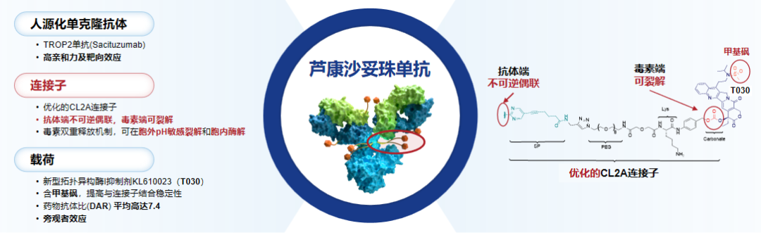 芦康沙妥珠单抗的出色临床表现,与出色的药物设计密不可分:研发方科伦博泰在既有的ADC药物设计成功理念基础上继续创新优化,选用具有旁观者效应的全新拓扑异构酶I抑制剂T030为载荷,并以优化的抗体端不可逆偶联、药物端可裂解连接子CL2A,将载荷连接到靶向TROP2的人源化单克隆抗体(sacituzumab)上,药物抗体比(DAR)高达7.4,与国外同类药物处于同一水平,且具有差异化优势,为临床研究中良好的疗效和安全性奠定了基础。