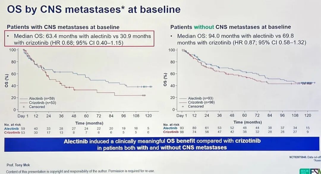 经过七年随访,本研究数据已更为成熟,所呈现的可能是迄今晚期(IV期)非小细胞肺癌患者中最长的总生存期数据之一。在2025年ESMO大会上公布的最终分析结果显示,与克唑替尼相比,一线阿来替尼为该患者群体带来了总生存期获益与更长缓解持续时间,并且这一获益不受基线是否存在中枢神经系统转移的影响。