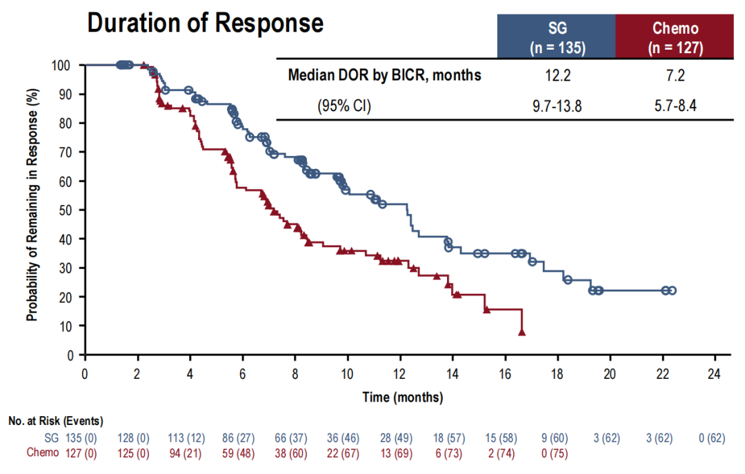 在肿瘤缓解方面,SG组和化疗组的ORR相似(48%vs 46%),但SG组的持续缓解时间(DoR)延长了5个月(12.2 vs 7.2个月)。OS数据尚未成熟。179例患者在化疗后接受后续治疗,其中147例(82%)接受了SG。SG组的PFS2(定义为:从随机到二线治疗发生进展或死亡)相较于化疗组延长4.2个月,二次进展或死亡风险降低30%(18.2 vs 14.0个月,HR 0.7,95%CI:0.55-0.90)。